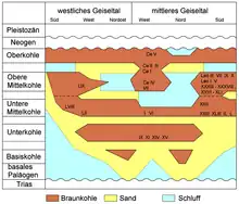 L'ensemble des dépôts paléogènes atteignent dans le Geiseltal une puissance allant jusqu'à 200 m, mais se limitent largement à l'Éocène (entre 56 et 34 millions d'années). Ces sédiments tertiaires ont été commencés par des argiles et des limons, et en partie des éléments plus grossiers. La puissance du lignite principalement en couches minces, voire en feuilles, se situe entre 30 et 80 m, mais dépasse par endroits 120 m[7]. En général, le lignite du Geiseltal est réparti en quatre filons principaux : inférieur, moyen (séparé en moyen inférieur et moyen supérieur) et supérieur, mais il présente aussi localement au nord un filon de base. Tous les filons sont séparés en sous-filons. Individuellement, les filons atteignent une puissance de 10 à 60 m. Ils sont séparés par des sédiments de limon sableux, qui représentent des horizons-guides et servent à la délimitation des filons. Dans le Geiseltal sud, dans la mine Cecilie, on a observé néanmoins un passage continu des filons moyen au supérieur. L'étendue des divers filons de lignite du nord vers le sud est marquée différemment, et reliée à l'effondrement à la suite des dissolutions et érosion souterraine, mais elle se continue en général avec l'altitude croissante des filons vers le sud. Seul le filon supérieur couvre la surface dans le Geiseltal. La collection de fossiles très riche de l'Éocène provient surtout des filons inférieur et moyen[3],[8],[9].