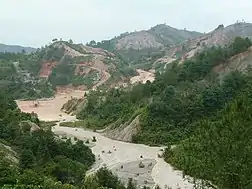 Des gisements d'éléments de terres rares hébergés par des régolithes se trouvent le long des crêtes des collines granitiques basses du sud de la Chine[10]. Le gisement de minerai peut être établi en quatre couches en fonction de son degré d'altération dont la plus inférieure du sol dégradé contient les corps minéralisés[11],[12],[13],[3],[14].