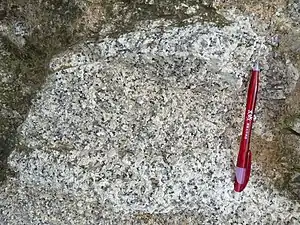 - Les granitoïdes enrichis en éléments de terres rares lourds se forment par auto-métasomatose. Il s'agit d'un processus d'altérations chimiques du magma felsique récemment cristallisé par le fluide hydrothermal restant (par exemple l'eau, le CO2) au stade ultérieur de la cristallisation du magma[19]. Au cours de l'altération chimique, par diverses réactions chimiques avec les fluides hydrothermaux, les éléments de terres rares lourds sont ensuite introduits dans les minéraux secondaires le long des veinules[19].