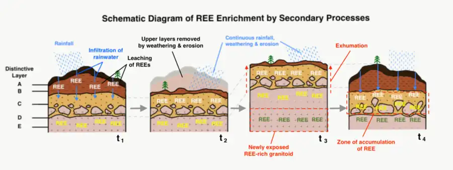 Le processus secondaire (c'est-à-dire l'altération) est essentiel à l'enrichissement ultérieur des granitoïdes riches en éléments de terres rares légers et lourds. Il transforme le granitoïde en un corps minéralisé rentable à extraire. Par conséquent, le climat chaud et humide, associé à un sol légèrement acide dans les zones subtropicales, favorise la formation de gisements. Une combinaison d'altérations chimiques, physiques et microbiologiques intenses[13] permet l'élimination des ETR dans la couche supérieure, plus acide, complètement altérée, puis la migration vers le bas avec l'eau de pluie et, éventuellement, le dépôt (et la concentration) dans la couche inférieure, moins acide et modérément altérée[16],[24],[25],[26] — Les terres rares forment un complexe plus stable dans le sol de pH plus élevé —[20].