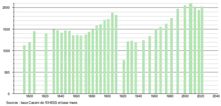 L'évolution du nombre d'habitants est connue à travers les recensements de la population effectués dans la commune depuis 1793. Pour les communes de moins de 10 000 habitants, une enquête de recensement portant sur toute la population est réalisée tous les cinq ans, les populations légales des années intermédiaires étant quant à elles estimées par interpolation ou extrapolation[35]. Pour la commune, le premier recensement exhaustif entrant dans le cadre du nouveau dispositif a été réalisé en 2007[36].