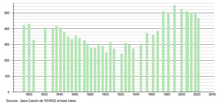 L'évolution du nombre d'habitants est connue à travers les recensements de la population effectués dans la commune depuis 1793. Pour les communes de moins de 10 000 habitants, une enquête de recensement portant sur toute la population est réalisée tous les cinq ans, les populations légales des années intermédiaires étant quant à elles estimées par interpolation ou extrapolation[38]. Pour la commune, le premier recensement exhaustif entrant dans le cadre du nouveau dispositif a été réalisé en 2007[39].
