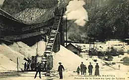 La récolte de la glace s’effectuait de décembre à mars ou avril et donnait du travail pour l'hiver à de nombreux agriculteurs de la région, venant notamment de Charix ou du plateau de Retord[3]. Quand l’épaisseur de la glace sur le lac atteignait une quinzaine de centimètres, le personnel permanent des glacières hissait un drapeau au sommet du plus haut bâtiment et actionnait une corne de brume[1] : ce signal indiquait l’ouverture du chantier et de l'embauche pour le travail de la glace. En 1879, jusqu’à 300 ouvriers travaillaient en deux équipes, de jour et de nuit. Les ouvriers étaient payés 35 centimes de l'heure la journée et 42 centimes la nuit[2]. Une trentaine de personnes composait le personnel permanent, chargé de l’entretien des installations, du stockage et de l’expédition de la glace.