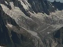 Le Jardin de Talèfre au centre du glacier de Talèfre avec le petit glacier du Moine sur la gauche vus depuis la Vallée Blanche au sud-ouest.