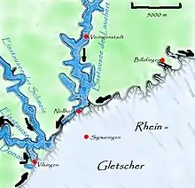 - (de) Cet article est partiellement ou en totalité issu de l’article de Wikipédia en allemand intitulé « Rheingletscher » (voir la liste des auteurs).