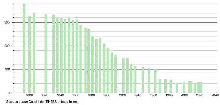 L'évolution du nombre d'habitants est connue à travers les recensements de la population effectués dans la commune depuis 1793. Pour les communes de moins de 10 000 habitants, une enquête de recensement portant sur toute la population est réalisée tous les cinq ans, les populations légales des années intermédiaires étant quant à elles estimées par interpolation ou extrapolation[14]. Pour la commune, le premier recensement exhaustif entrant dans le cadre du nouveau dispositif a été réalisé en 2008[15].