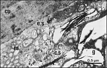 De plus, ces mêmes éléments, recouverts par la cuticule comme des cellules “ hypodermiques” banales, peuvent être rattachés aux glandes tégumentaires arthropodiennes de classe 1 telles que Noirot et Quennedey (1974)[5] les ont définies chez les Insectes (Schéma)