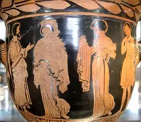 Les dons de Médée à Créuse (?), cratère lucanien à figures rouges, v. 390 av. J.-C., musée du Louvre (CA 2193)