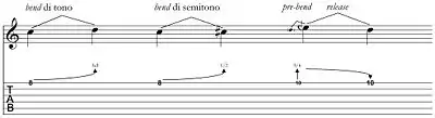 - La guitare électrique, dont le son amplifié dépasse les limites des instruments acoustiques, compte parmi ses techniques d'exécution deux effets de glissato qui s'obtiennent soit en pressant et en poussant verticalement la corde avec le bout du doigt (en anglais : bend) de la main qui tient le manche, ce qui donne un glissando ascendant, soit en agissant pesamment sur le levier du vibrato dont sont pourvus certains modèles. Le bend peut correspondre à un intervalle d'un ton indiqué par full dans la tablature ou à d'autres distances, mesurées par fractions de ton (1/2 pour le demi-ton, 3/4 pour 3/4 de ton, etc.). Release indique à l'inverse l'effet de glissando obtenu par le relâchement de la corde précédemment tirée par un pre-bend consistant à tirer la corde sans glissando ascendant.