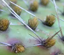 Sur ces plantes, les glochides ont remplacé les épines, ou parfois s'y ajoutent pour améliorer encore la protection. Comme les épines, ils poussent sur les aréoles des plantes.