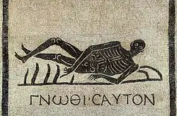 Un Memento mori en mosaïque (Ier siècle apr. J.-C.) accompagné de l'inscription Gnothi seauton. Provient des excavations de l'église San Gregorio al Celio (Rome) ; actuellement au Musée des Thermes de Dioclétien.