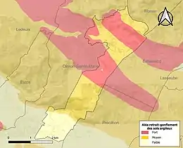 Le retrait-gonflement des sols argileux est susceptible d'engendrer des dommages importants aux bâtiments en cas d’alternance de périodes de sécheresse et de pluie[36]. 82,2 % de la superficie communale est en aléa moyen ou fort (59 % au niveau départemental et 48,5 % au niveau national)[Carte 5]. Depuis le , en application de la loi ELAN, différentes contraintes s'imposent aux vendeurs, maîtres d'ouvrages ou constructeurs de biens situés dans une zone classée en aléa moyen ou fort[Note 8],[37].