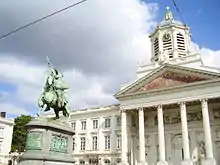Nonobstant cette vision romantique d'un Godefroy (déjà) belge, cette interprétation n'est pas absolument fantaisiste et sans fondement. En effet, sur la statue de Godefroy sise sur la place Royale de Bruxelles, outre la mention qui y est faite de sa qualité de premier souverain de Jérusalem, l'on y voit aussi mentionné son titre de duc de Basse-Lotharingie. Or, ce duché, existant de 959 à 1190, couvrait une bonne partie du territoire de la Belgique actuelle et, à son extinction, sa titulature fut léguée perpétuellement aux ducs de Brabant, et y était évoquée sous le vocable composé de duc Brabant et de Lothier. Ainsi Godefroy porta-t-il le titre de duc d'un État largement précurseur de l'État belge indépendant et dont les souverains étaient intronisés sur les marches de l'église Saint-Jacques-sur-Coudenberg, à quelques mètres de l'emplacement de la statue. Celle-ci fut d'ailleurs élevée en 1848 au centre de la place Royale où le premier roi des Belges, Léopold Ier, prêta le serment constitutionnel le , sur les marches de l’église Saint-Jacques-sur-Coudenberg comme traditionnellement[56] avant lui les souverains du duché de Brabant et de Lothier[57].