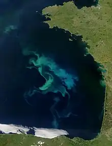 Efflorescence algale dans le Golfe de Gascogne, vue par satellite.