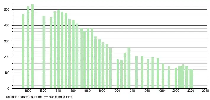 L'évolution du nombre d'habitants est connue à travers les recensements de la population effectués dans la commune depuis 1793. Pour les communes de moins de 10 000 habitants, une enquête de recensement portant sur toute la population est réalisée tous les cinq ans, les populations légales des années intermédiaires étant quant à elles estimées par interpolation ou extrapolation[34]. Pour la commune, le premier recensement exhaustif entrant dans le cadre du nouveau dispositif a été réalisé en 2004[35].