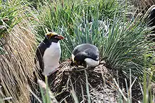 Les gorfous dorés adultes s'accouplent généralement en octobre et pondent leurs œufs début novembre[28]. Le nid consiste en un raclement superficiel du sol qui peut être entouré de cailloux, de rochers, d'herbe ou de touffes de tussack (en Géorgie du Sud)[10]. Les nids sont densément regroupés et se répartissent généralement entre 66 et 86 mètres à partir du centre de la colonie[10]. Une femelle pond normalement deux œufs par an. Le premier pèse entre 90 et 94 grammes, soit environ deux tiers du poids du second qui oscille entre 145 et 155 grammes. Ce premier œuf a peu de chance d'éclore[10]. Les deux œufs représentent en moyenne 4,8 % du poids du corps de la mère et sont composés à 20 % de jaune, 66 % de blanc et 14 % de coquille[29]. Comme pour les autres espèces de manchots, cette coquille est épaisse pour minimiser les risques de casse et le jaune est important, ce qui correspond à une naissance à un stade avancé de développement[30]. Une partie du jaune subsiste lors de l'éclosion et est consommée par le petit lors de ses premiers pas[30].