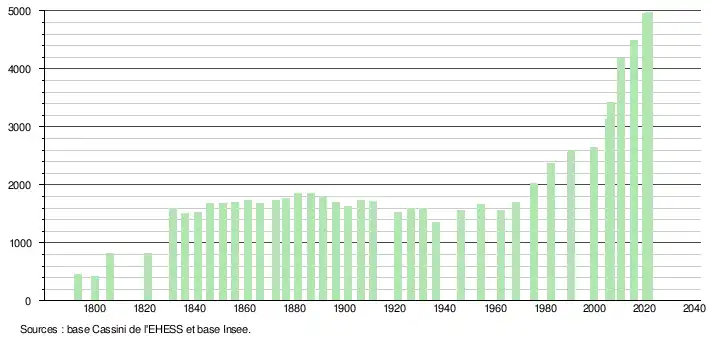 L'évolution du nombre d'habitants est connue à travers les recensements de la population effectués dans la commune depuis 1793. Pour les communes de moins de 10 000 habitants, une enquête de recensement portant sur toute la population est réalisée tous les cinq ans, les populations légales des années intermédiaires étant quant à elles estimées par interpolation ou extrapolation[31]. Pour la commune, le premier recensement exhaustif entrant dans le cadre du nouveau dispositif a été réalisé en 2005[32].
