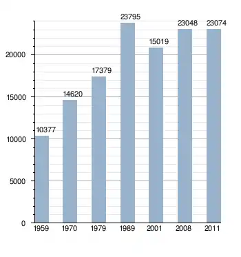 En 2001, la population s'élevait officiellement à 20 840 habitants[11], mais des années d'émigration, principalement dans les années 1990, font penser qu'elle doit à peine dépasser les 10 000[12]. Elle compte toutefois officiellement 23 074 habitants en 2011[9].