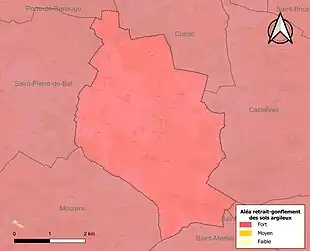 Le retrait-gonflement des sols argileux est susceptible d'engendrer des dommages importants aux bâtiments en cas d’alternance de périodes de sécheresse et de pluie. La totalité de la commune est en aléa moyen ou fort (67,4 % au niveau départemental et 48,5 % au niveau national). Sur les 222 bâtiments dénombrés sur la commune en 2019, 222 sont en aléa moyen ou fort, soit 100 %, à comparer aux 84 % au niveau départemental et 54 % au niveau national. Une cartographie de l'exposition du territoire national au retrait gonflement des sols argileux est disponible sur le site du BRGM[20],[Carte 2].