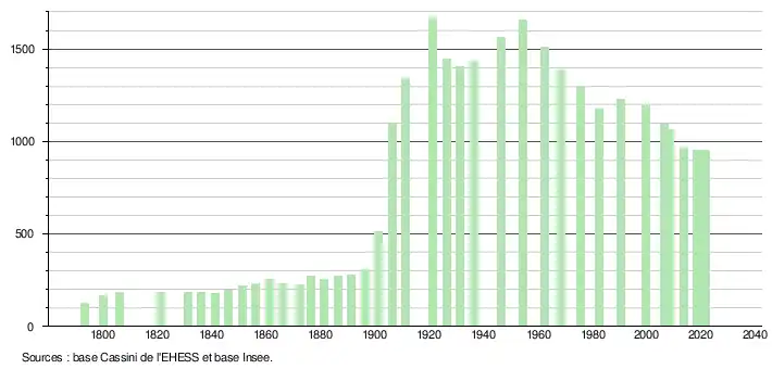 L'évolution du nombre d'habitants est connue à travers les recensements de la population effectués dans la commune depuis 1793. Pour les communes de moins de 10 000 habitants, une enquête de recensement portant sur toute la population est réalisée tous les cinq ans, les populations légales des années intermédiaires étant quant à elles estimées par interpolation ou extrapolation[42]. Pour la commune, le premier recensement exhaustif entrant dans le cadre du nouveau dispositif a été réalisé en 2008[43].
