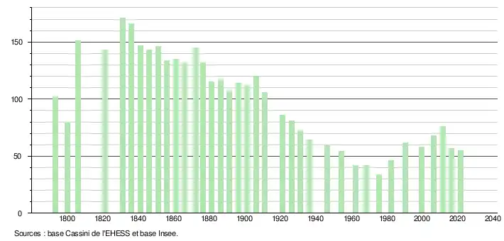 | L'évolution du nombre d'habitants est connue à travers les recensements de la population effectués dans la commune depuis 1793. Pour les communes de moins de 10 000 habitants, une enquête de recensement portant sur toute la population est réalisée tous les cinq ans, les populations légales des années intermédiaires étant quant à elles estimées par interpolation ou extrapolation[33]. Pour la commune, le premier recensement exhaustif entrant dans le cadre du nouveau dispositif a été réalisé en 2006[34]. En 2021, la commune comptait 55 habitants[Note 8], en diminution de 12,7 % par rapport à 2015 (Hautes-Pyrénées : +1,04 %, France hors Mayotte : +1,84 %). |