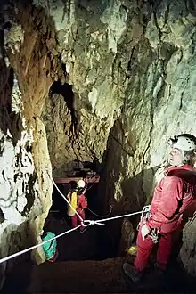 1. Le cadastre français place l'entrée à 31 m de la ligne de la frontière côté français[1], ce qui veut dire que la salle de la base du puits est internationale.
