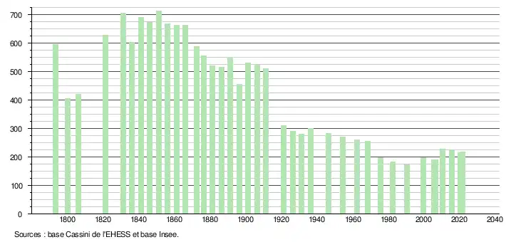 L'évolution du nombre d'habitants est connue à travers les recensements de la population effectués dans la commune depuis 1793. Pour les communes de moins de 10 000 habitants, une enquête de recensement portant sur toute la population est réalisée tous les cinq ans, les populations légales des années intermédiaires étant quant à elles estimées par interpolation ou extrapolation[24]. Pour la commune, le premier recensement exhaustif entrant dans le cadre du nouveau dispositif a été réalisé en 2005[25].