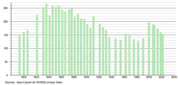 L'évolution du nombre d'habitants est connue à travers les recensements de la population effectués dans la commune depuis 1793. Pour les communes de moins de 10 000 habitants, une enquête de recensement portant sur toute la population est réalisée tous les cinq ans, les populations légales des années intermédiaires étant quant à elles estimées par interpolation ou extrapolation[16]. Pour la commune, le premier recensement exhaustif entrant dans le cadre du nouveau dispositif a été réalisé en 2008[17].