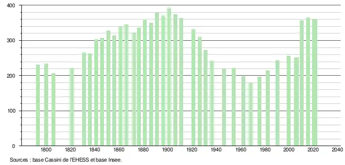 | L'évolution du nombre d'habitants est connue à travers les recensements de la population effectués dans la commune depuis 1793. Pour les communes de moins de 10 000 habitants, une enquête de recensement portant sur toute la population est réalisée tous les cinq ans, les populations légales des années intermédiaires étant quant à elles estimées par interpolation ou extrapolation[29]. Pour la commune, le premier recensement exhaustif entrant dans le cadre du nouveau dispositif a été réalisé en 2005[30]. En 2021, la commune comptait 359 habitants[Note 3], en diminution de 1,64 % par rapport à 2015 (Landes : +4,9 %, France hors Mayotte : +1,84 %). |