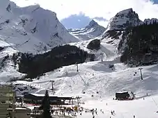 Gourette en été, dominée par le pic de Ger. Dès lors que l'on s'éloigne de la station, le cirque de Gourette apparait dans toute son étendue. | |||