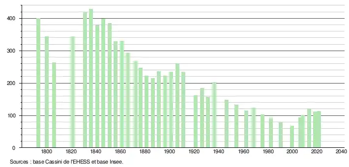L'évolution du nombre d'habitants est connue à travers les recensements de la population effectués dans la commune depuis 1793. Pour les communes de moins de 10 000 habitants, une enquête de recensement portant sur toute la population est réalisée tous les cinq ans, les populations légales des années intermédiaires étant quant à elles estimées par interpolation ou extrapolation[19]. Pour la commune, le premier recensement exhaustif entrant dans le cadre du nouveau dispositif a été réalisé en 2008[20].