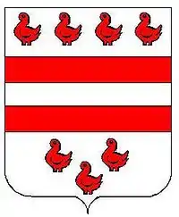 "d'argent à deux fasces de gueules, accompagné de sept merlettes du même, quatre rangées en chef et trois en pointe en deux et un"