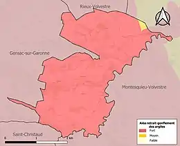 Le retrait-gonflement des sols argileux est susceptible d'engendrer des dommages importants aux bâtiments en cas d’alternance de périodes de sécheresse et de pluie. La totalité de la commune est en aléa moyen ou fort (88,8 % au niveau départemental et 48,5 % au niveau national). Sur les 74 bâtiments dénombrés sur la commune en 2019, 74 sont en aléa moyen ou fort, soit 100 %, à comparer aux 98 % au niveau départemental et 54 % au niveau national. Une cartographie de l'exposition du territoire national au retrait gonflement des sols argileux est disponible sur le site du BRGM[25],[Carte 3].
