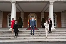 Au matin du , la présidence du gouvernement confirme que Unidas Podemos disposera de cinq membres au sein du Conseil des ministres, dont un poste de vice-président délégué aux Droits sociaux confié à Pablo Iglesias. Irene Montero sera ministre de l'Égalité, Yolanda Díaz ministre du Travail, Manuel Castells ministre de l'Enseignement supérieur, et Alberto Garzón ministre de la Consommation[26]. Il est parallèlement annoncé que Carmen Calvo est reconduite comme vice-présidente et ministre de la Présidence, avec les compétences sur la mémoire démocratique, et que la ministre de l'Économie Nadia Calviño et la ministre de la Transition écologique Teresa Ribera sont promues vice-présidentes, obtenant respectivement des compétences en matière de transition numérique et de lutte contre la désertification rurale[27]. La ministre des Finances María Jesús Montero est elle est choisie comme porte-parole du gouvernement, réunissant ces deux fonctions pour la première fois en Espagne et pour la deuxième fois en Europe après Alain Juppé à la fin des années 1980 en France[28].