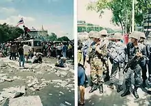 Du 17 au 20 mai 1992, 200 000 personnes manifestent en masse contre le gouvernement militaire et la nomination de Suchinda Khra-prayun à Bangkok. Les protestations sont notamment menés par le charismatique général Chamlong Srimuang (en), chef et membre de la Chambre des représentants du parti Palang Dharma (en), ancien gouverneur de Bangkok. Ces événements, dits du « Mai noir » en français (en thaï พฤษภาทมิฬ ; RTGS : Phruetsapha Thamin), sont réprimées dans le sang : les forces de l'ordre ouvrent le feu sur les manifestants le 17 mai ; la loi martiale est instaurée et les rassemblements de plus de 10 personnes interdits ; pendant trois jours, la capitale est le théâtre d'émeutes durant lesquelles des bâtiments administratifs sont incendiés. La répression est sévère et son bilan avoisine les 50 morts et des centaines de blessés[4].
