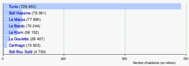 Le gouvernorat de Tunis est divisé en huit municipalités dont le centre, Tunis, est la plus peuplée avec 728 453 habitants, la deuxième étant Sidi Hassine avec seulement 79 381 habitants. Viennent ensuite les municipalités de La Marsa, Le Bardo, Le Kram, La Goulette puis Carthage avec respectivement 79 381, 77 890, 58 152, 28 407 et 15 922 habitants. La moins peuplée des municipalités est celle de Sidi Bou Saïd, avec seulement 4 793 habitants.