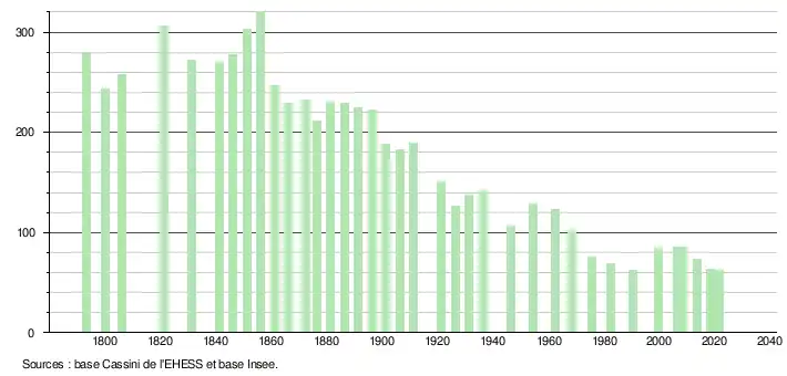 L'évolution du nombre d'habitants est connue à travers les recensements de la population effectués dans la commune depuis 1793. Pour les communes de moins de 10 000 habitants, une enquête de recensement portant sur toute la population est réalisée tous les cinq ans, les populations légales des années intermédiaires étant quant à elles estimées par interpolation ou extrapolation[30]. Pour la commune, le premier recensement exhaustif entrant dans le cadre du nouveau dispositif a été réalisé en 2008[31].