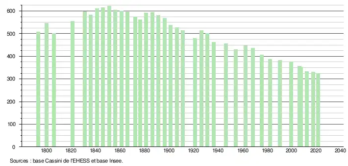 L'évolution du nombre d'habitants est connue à travers les recensements de la population effectués dans la commune depuis 1793. Pour les communes de moins de 10 000 habitants, une enquête de recensement portant sur toute la population est réalisée tous les cinq ans, les populations légales des années intermédiaires étant quant à elles estimées par interpolation ou extrapolation[33]. Pour la commune, le premier recensement exhaustif entrant dans le cadre du nouveau dispositif a été réalisé en 2007[34].