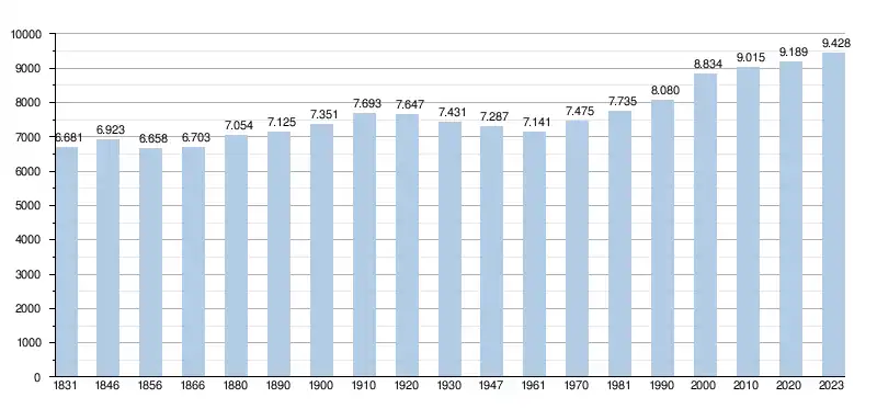Les chiffres des années 1831 à 1970 tiennent compte des chiffres des anciennes communes fusionnées.