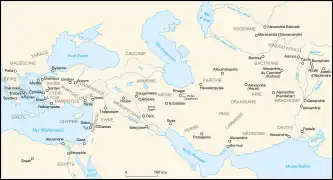 À la mort d'Alexandre le Grand en , date qui marque le début de l'époque hellénistique, son immense empire est partagé entre ses principaux généraux, les Diadoques. Ptolémée, Séleucos et Antigone fondent des dynasties qui règnent sur de vastes royaumes. La prépondérance des rois et des royaumes dans le jeu politique est un changement de taille, reléguant les cités au rang de pions dans l'échiquier politique qui se met en place, généralement dans l'incapacité de s'émanciper. Les rois légitiment leur pouvoir par la victoire et mettent en place un culte royal[55]. Les Lagides (ou Ptolémées) dominent l'Égypte, disposant d'un royaume cohérent territorialement, où ils sont peu inquiétés. Ils étendent également leur influence vers Chypre et le monde égéen. Les Séleucides dominent au départ les pays asiatiques allant du Proche-Orient jusqu'à l'Asie centrale, soit la majeure partie de l'ancien empire perse, mais ils perdent rapidement les territoires des confins et leur empire se concentre surtout sur la Syrie et la Mésopotamie. Des royaumes grecs se constituent sur une partie des anciennes provinces séleucides, en Bactriane (royaume gréco-bactrien) et dans la vallée de l'Indus (royaumes indo-grecs). Après avoir été disputée entre plusieurs prétendants, la Macédoine passe sous le contrôle des Antigonides et redevient une puissance essentiellement européenne, et doit composer avec sa voisine, l'Épire. L'Anatolie est divisée en plusieurs royaumes plus ou moins hellénisés, le plus puissant étant celui de Pergame dirigé par les Attalides. En Grèce et en Asie Mineure certaines cités préservent leur autonomie, mais elles ne sont alors plus en mesure de jouer un rôle politique notable, à l'exception de Rhodes qui dispose d'une flotte puissante. La Grèce continentale voit l'émergence d’États fédéraux (Arcadie, Achaïe, Étolie) qui sont en mesure de tenir tête aux royaumes[56],[54]. La période est marquée par un état de guerre quasi-permanent, entre grands royaumes, cités, fédérations, mais également des puissances extérieures (Parthes, Rome)[57].