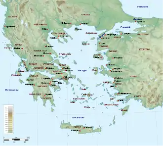 - des identités en fonction des ethnè (ethnos au singulier), des « peuples » ou groupes tribaux se revendiquant une origine commune au sein du groupe grec, à savoir les Achéens, les Éoliens, les Doriens et les Ioniens, avec également des sanctuaires les réunissant, même si cela n'empêche pas l'existence de farouches rivalités au sein de ces ensembles ; il ne s'agit pas à proprement parler d'ethnies au sens moderne car ces entités se reconnaissent comme des Hellènes, même si ces appartenances peuvent être invoquées dans des discours contre des rivaux relevant d'un autre ethnos (par exemple par les Athéniens contre les cités du Péloponnèse) ; il ne faut pas confondre ces entités avec leurs homonymes, les ethnè qui sont des organisations politiques (voir plus bas)[19],[20].