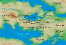 La Béotie est une région agricole riche. Sa principale cité est Thèbes, dirigée par un gouvernement oligarchique aux tendances très conservatrices. Sa principale rivale dans la région est Orchomène. Une autre cité importante, Platées, est résolument tournée vers Athènes et son régime démocratique. Thespies et Tanagra sont deux autres cités béotiennes au rôle politique notable. La région se dote sous la direction de Thèbes d'une organisation « fédérale », la « ligue béotienne, dans la seconde moitié du VIe siècle av. J.-C., donc peut-être avant les autres », mais qui semble à ce stade peu active[95],[96]. Durant les guerres médiques, les cités béotiennes se partagent entre les alliés des Perses (ou du moins neutres, ce qui revient aux mêmes pour les cités anti-perses) et ceux qui rejoignent les cités grecques résistantes. Thèbes, qui portera longtemps les stigmates de son « médisme », et la Béotie connaissent un affaiblissement marqué durant les décennies suivantes, culminant en une domination athénienne sur la période 457-446, alors que la confédération semble disparaître, ou du moins ne quasiment plus fonctionner. Après 446 les cités sont plus actives, la confédération est réactivée et fonctionne pleinement jusqu'en 386. Suivant ce qui ressort des écrits de Thucydide et des Helléniques d'Oxyrhynque, elle fonctionne alors autour de 11 districts élisant chacun 60 membres d'un conseil fédéral de 660 membres qui siège à hauteur d'un quart (soit 165 membres) à tour de rôle. Ces mêmes districts fournissent chacun 1 000 soldats et 100 cavaliers pour l'armée fédérale, chaque groupe étant dirigé par un béotarque. Chaque cité fournit des représentants (sélectionnés parmi un groupe oligarchique, en principe des propriétaires terriens) à hauteur de sa population, Thèbes ayant la part la plus importante[97],[98],[99],[100].