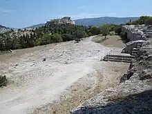 La Pnyx, lieu de l'assemblée des citoyens à l'époque classique, avec en arrière-plan la colline de l'aréopage et l'acropole.