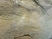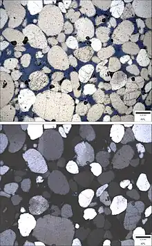 Les grains (donnant un toucher granuleux à la roche[6]) et le ciment entre ces grains peuvent avoir une composition différente selon l’origine et l’histoire de ce grès. Les dépôts successifs de sable se retrouvent dans la stratification du grès.