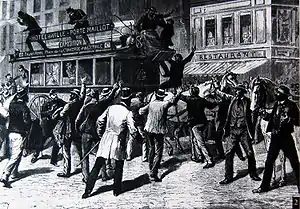 - juillet 1877 : ouvriers du rail. À Chicago, des affrontements entre la police et les grévistes eurent lieu sur South Halsted Street et firent 18 morts[11].