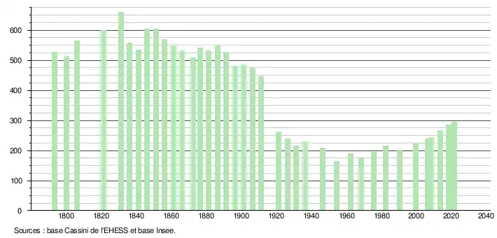 | L'évolution du nombre d'habitants est connue à travers les recensements de la population effectués dans la commune depuis 1793. Pour les communes de moins de 10 000 habitants, une enquête de recensement portant sur toute la population est réalisée tous les cinq ans, les populations légales des années intermédiaires étant quant à elles estimées par interpolation ou extrapolation[30]. Pour la commune, le premier recensement exhaustif entrant dans le cadre du nouveau dispositif a été réalisé en 2008[31]. En 2021, la commune comptait 294 habitants[Note 4], en augmentation de 8,89 % par rapport à 2015 (Lot : +0,89 %, France hors Mayotte : +1,84 %). |