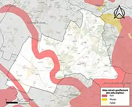 Le retrait-gonflement des sols argileux est susceptible d'engendrer des dommages importants aux bâtiments en cas d’alternance de périodes de sécheresse et de pluie. 19,1 % de la superficie communale est en aléa moyen ou fort (54,2 % au niveau départemental et 48,5 % au niveau national). Sur les 487 bâtiments dénombrés sur la commune en 2019, 92 sont en aléa moyen ou fort, soit 19 %, à comparer aux 57 % au niveau départemental et 54 % au niveau national. Une cartographie de l'exposition du territoire national au retrait gonflement des sols argileux est disponible sur le site du BRGM[13],[Carte 2].