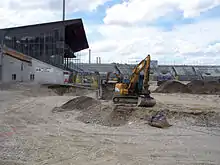 En 1958, la piste d'athlétisme est supprimée, le stade devient un véritable stade de football, les virages Est et Ouest ont été rénovés. Le virage Est reçoit une tribune en béton avec 12 000 places debout, sur le mur extérieur l'artiste Joachim Berthold (de) sculpte un bas relief représentant des personnes pratiquant du sport[7].