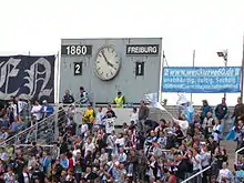 En même temps que la rénovation du virage Ouest, un panneau d'affichage est érigé en son milieu, il est toujours utilisé de nos jours. Au milieu du panneau de 6,30 mètres de longueur et 3 mètres de hauteur est installé une horloge. De part et d'autre de l'horloge sont disposés les crochets pour les panneaux des équipes et en dessous pour les panneaux de résultat. Jusqu'à aujourd'hui trois panneaux sont utilisés, avec l'inscription « 1860 », « BAYERN » et « GÄSTE» pour les visiteurs, plus tard le panneau sera changé en « GAST » (pour visiteur). Au début des années 80, pour les rencontres internationales les visiteurs avaient un panneau avec leur nom. Quand le SV Türk Gücü Munich et le SpVgg Unterhaching utilisaient le Grünwalder Stadion, ils avaient également un panneau personnalisé. Depuis avril 2011, un panneau coloré fait son apparition, marqué « TSV 1860 » en blanc sur fond bleu clair et « BAYERN » en blanc sur fond rouge sur l'autre face[8].