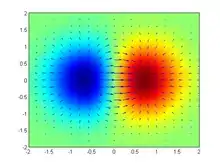 Pour une fonction , le gradient de f se confond avec la dérivée de f. Pour une fonction , où n est un nombre entier ≥ 2, le gradient de f en un point est un vecteur dont la direction est celle de la variation la plus forte de f au voisinage de ce point[2]. Cette notion est liée à celle de différentielle pour des fonctions à valeurs réelles : si f est différentiable en a, la différentielle Df(a) est une forme linéaire ; à cette forme linéaire, si l'ensemble de départ E est de dimension finie, on peut associer un vecteur qui est le gradient de f en a.